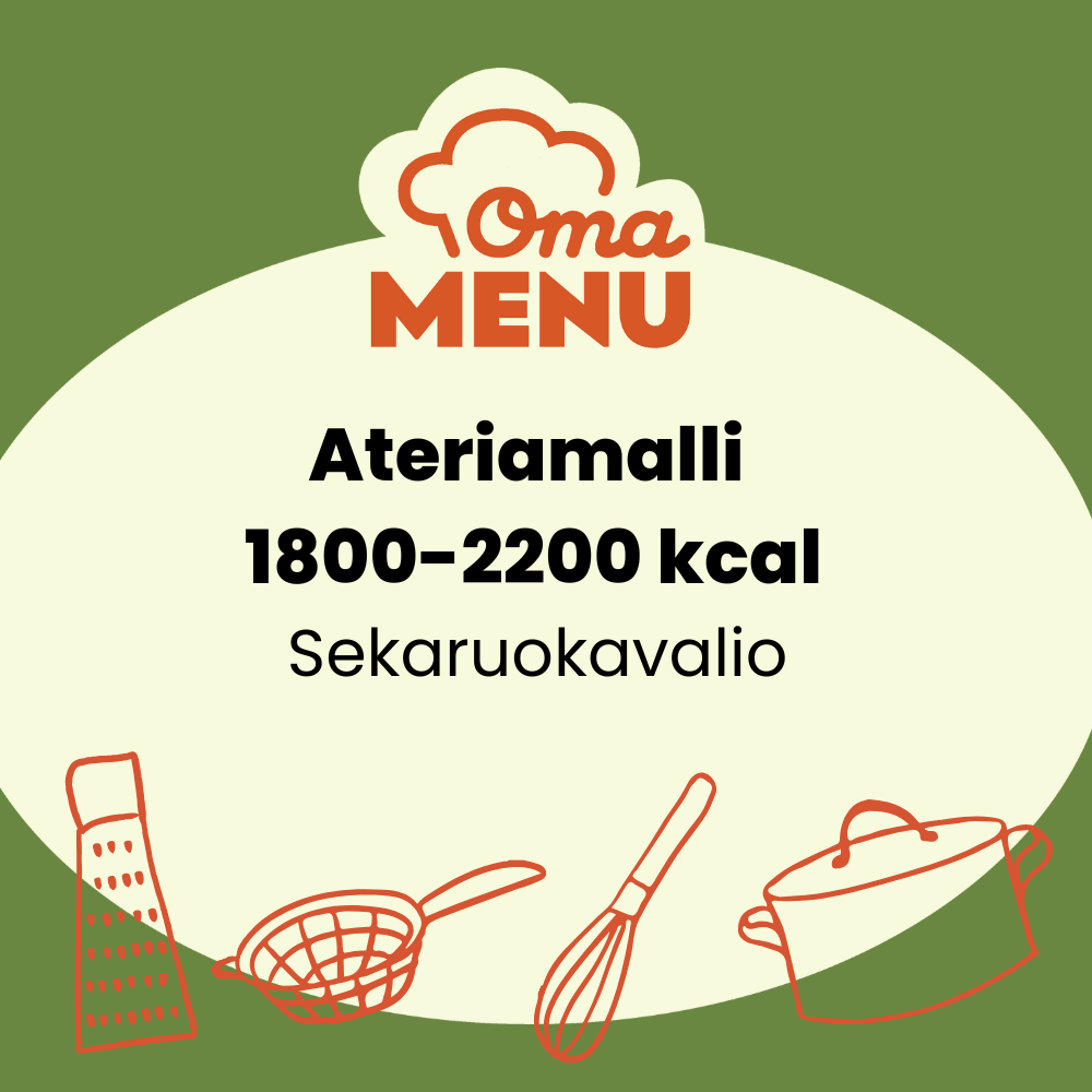 Ateriamallista saat konkreettisia esimerkkejä aterioista 1800-2200 kcal:n sekaruokavalioon. Opit yhdistämään ruoka-aineita fiksusti ja luomaan herkullisia, vaihtelevia aterioita, tavallista ruokaa hyödyntäen. Ateriamallia voit helposti muokata omien makumieltymystesi ja tarpeidesi mukaan.