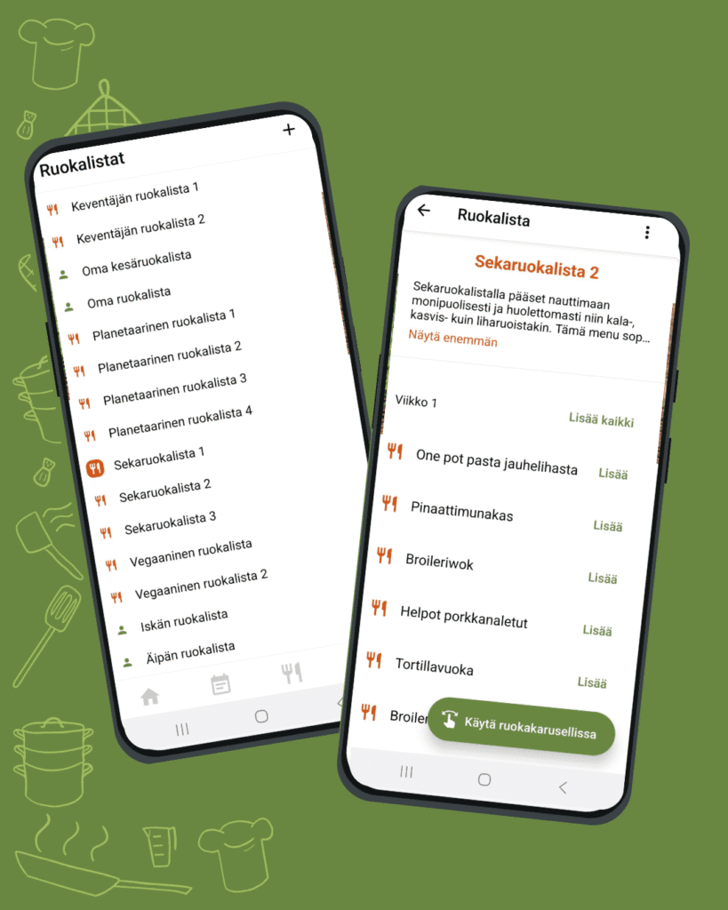 Ruokalistat-näkymästä löydät ammattilaisten suunnittelemia kokonaisuuksia, jotka voit ottaa käyttöön sellaisenaan tai muokata perheesi makuun sopiviksi. Voit myös luoda omia listoja alusta alkaen helpommin kuin koskaan.
